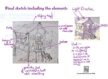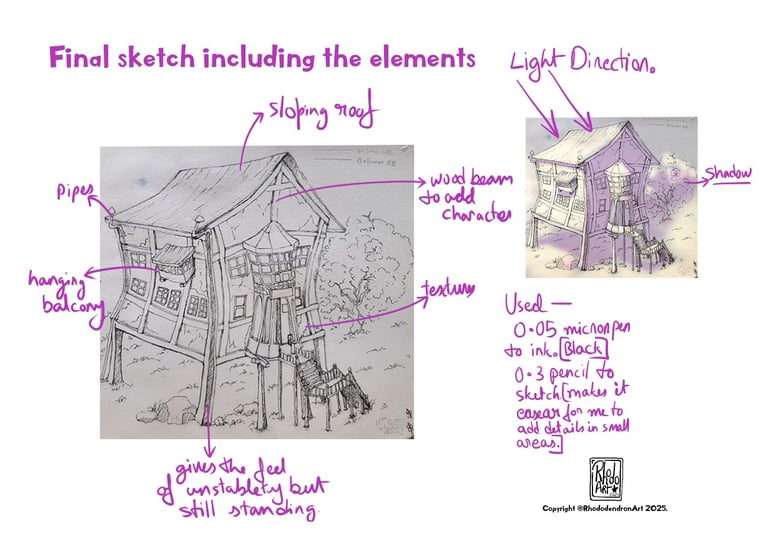 I used 0.3 mechanical pencil for the sketch since its easier to add details in small working space and used 0.05 micron pen for the lining. I made the house a bit wonky, old and unstable by adding the beams under the house and exaggerating the elements that I finalized from the thumbnails.