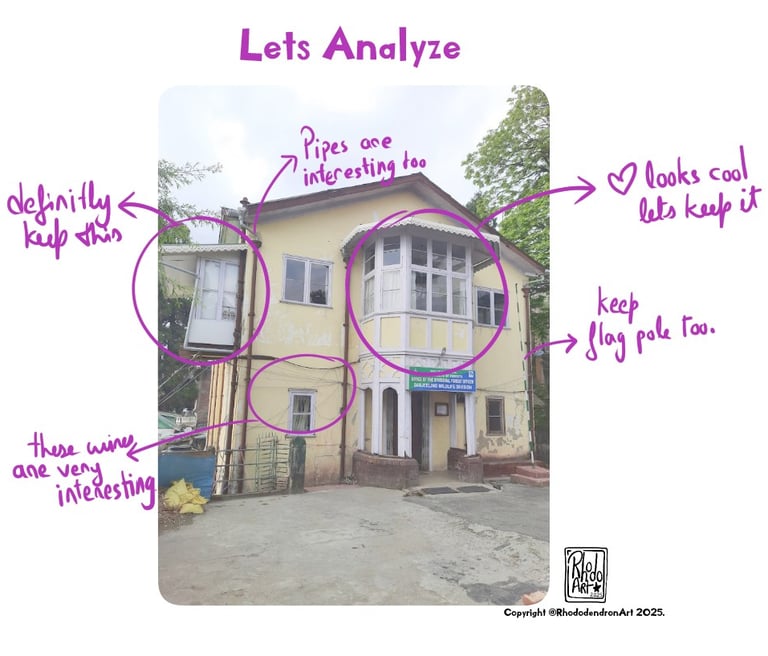 Next we make a sketch to understand our subject better. I will pay attention to the positioning and structure of the elements I am interested in. I will also keep perspective in mind.